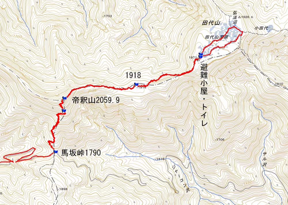 | 13:05 | 田代山 1926m | 1940 | 地形図の弘法沼の位置に田代山頂1926mの標識が立っていた | 弘法沼の北に1926.6mの三角点があるが、ここが田代山山頂の可能性がある |