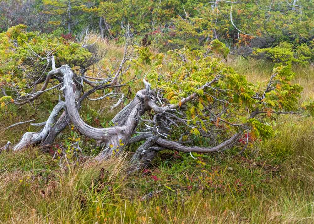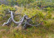 倒れかけているが、緑の葉を付けて懸命に生きるヒノキ