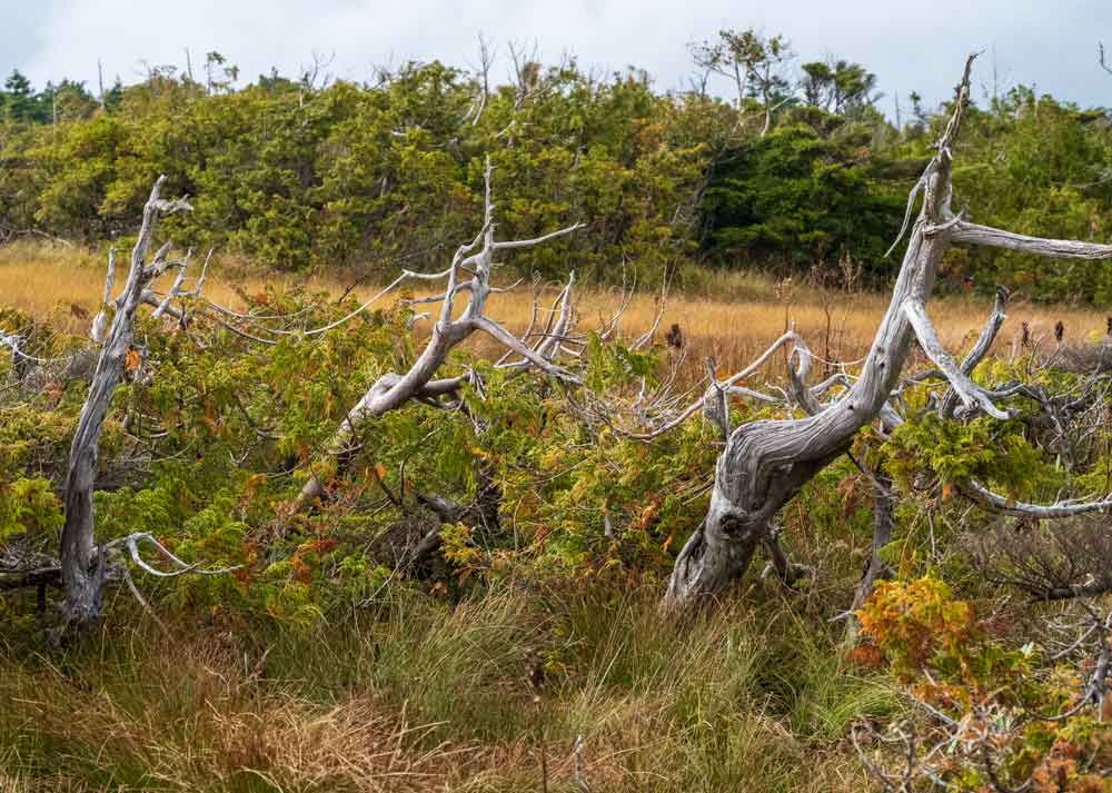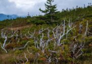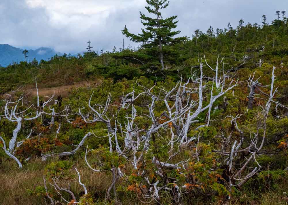 立ち枯れて白化した樹木、 後方にすっくと立つのはオオシラビソか